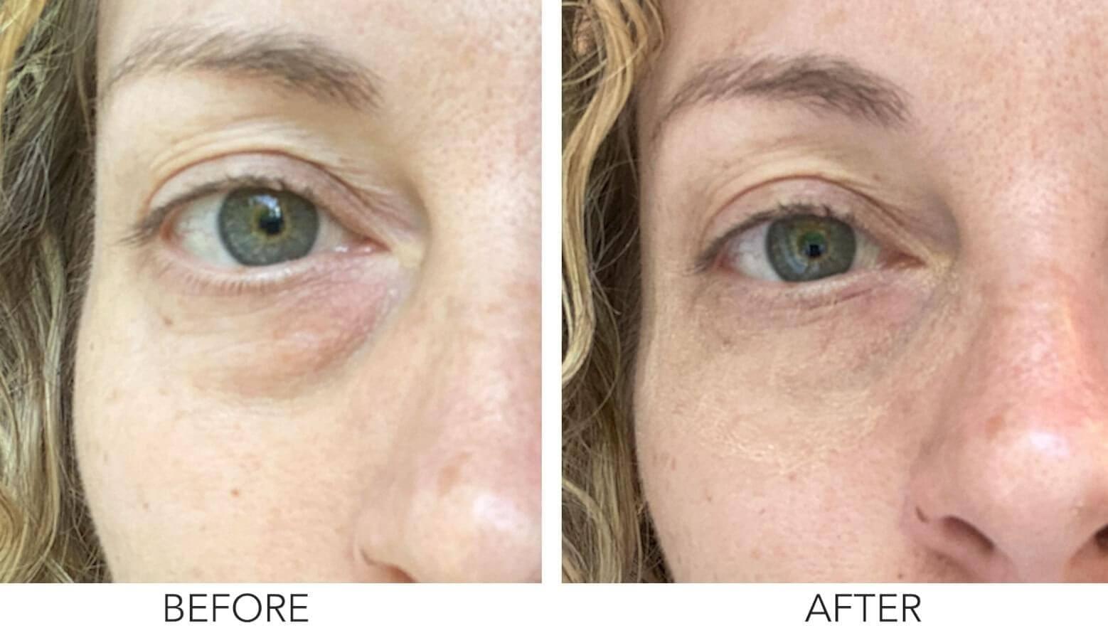 Look at the BEFORE puffy under eye bags on the LEFT! In just minutes the bags on the RIGHT are gone! Her eyes look younger, tighter, and firmer in minutes!
